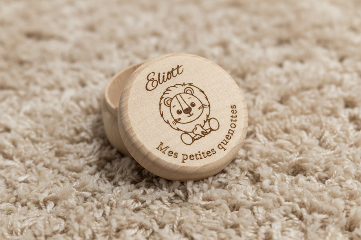 Craquez pour notre boîte à dents Lion personnalisée , un petit trésor idéal pour conserver délicatement les dents de lait et garder un précieux souvenir de chaque étape de l'enfance.