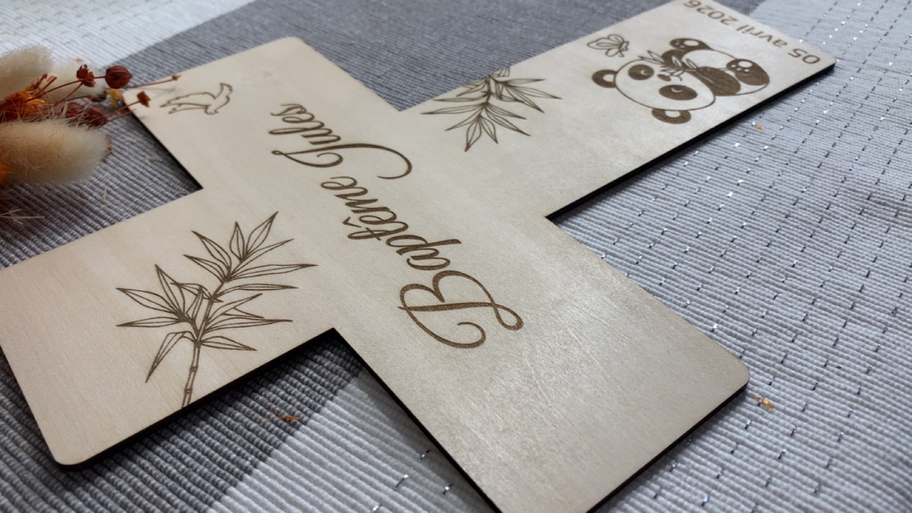 Croix en bois gravée – Souvenir de Baptême personnalisé Panda