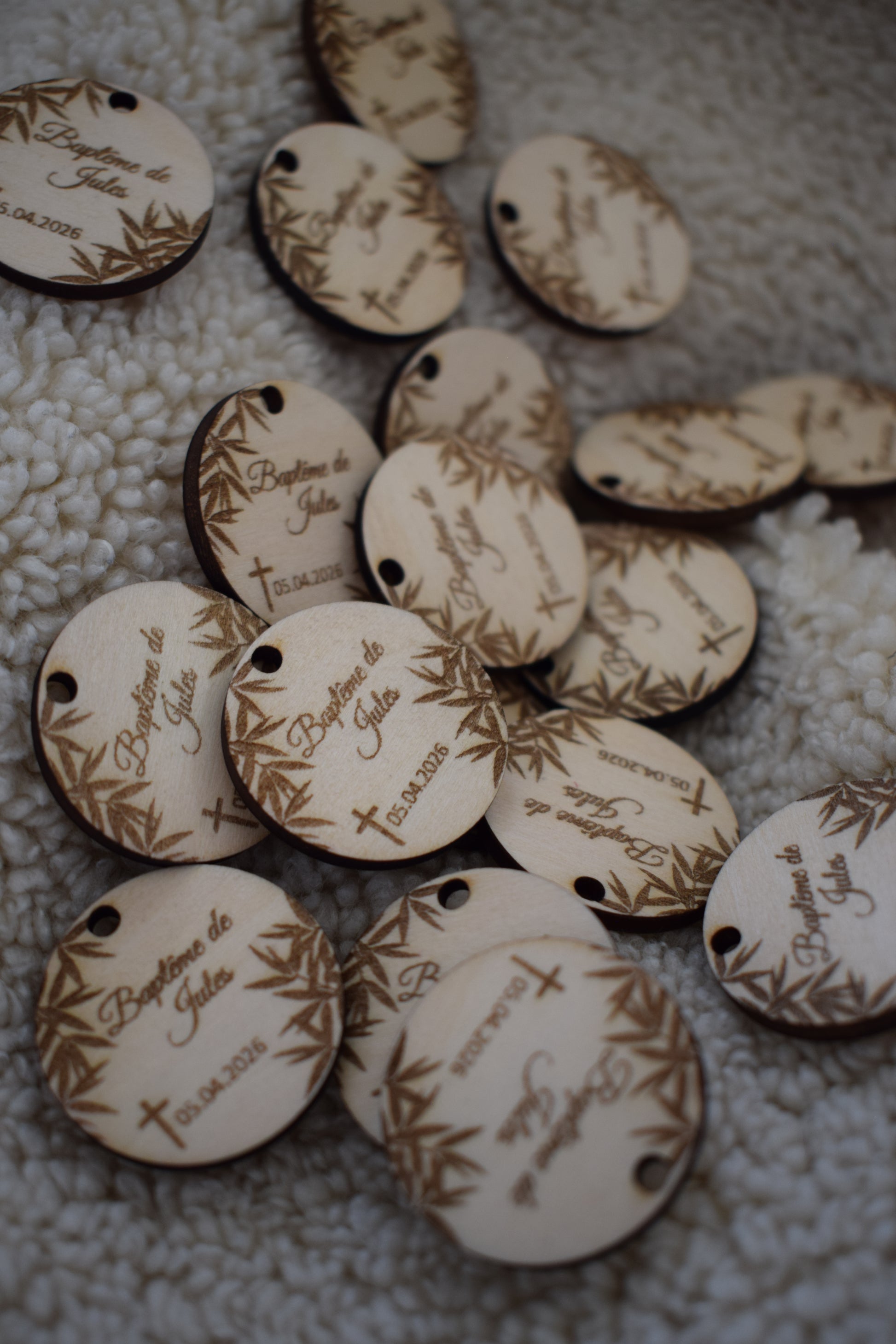 Offrez un souvenir unique et naturel avec notre médaillon en bois gravé personnalisé pour baptême décoré de délicates feuilles de bambou . Élégant et authentique, ce médaillon en bois personnalisable est idéal comme cadeau de baptême ou souvenir invité.