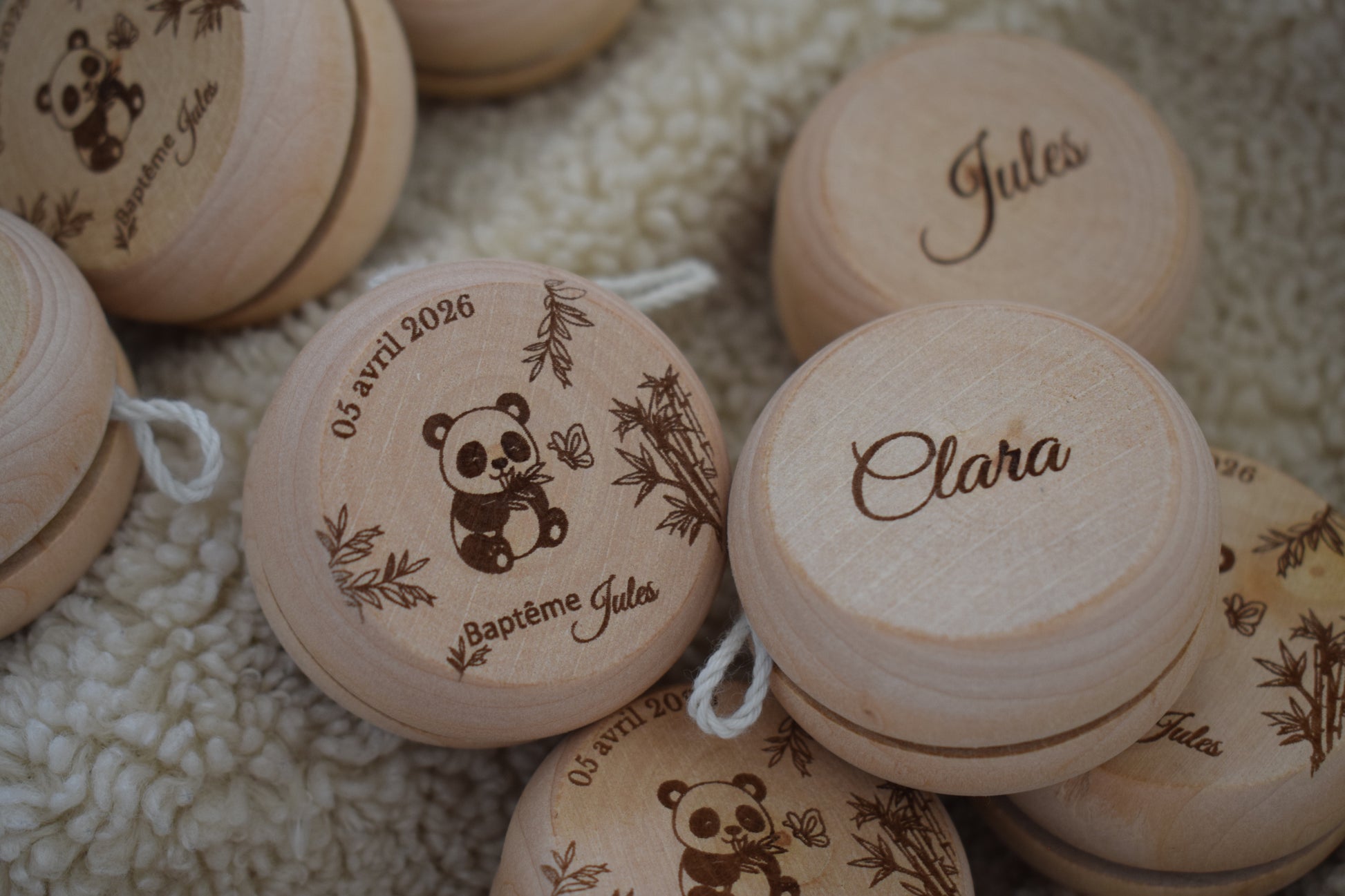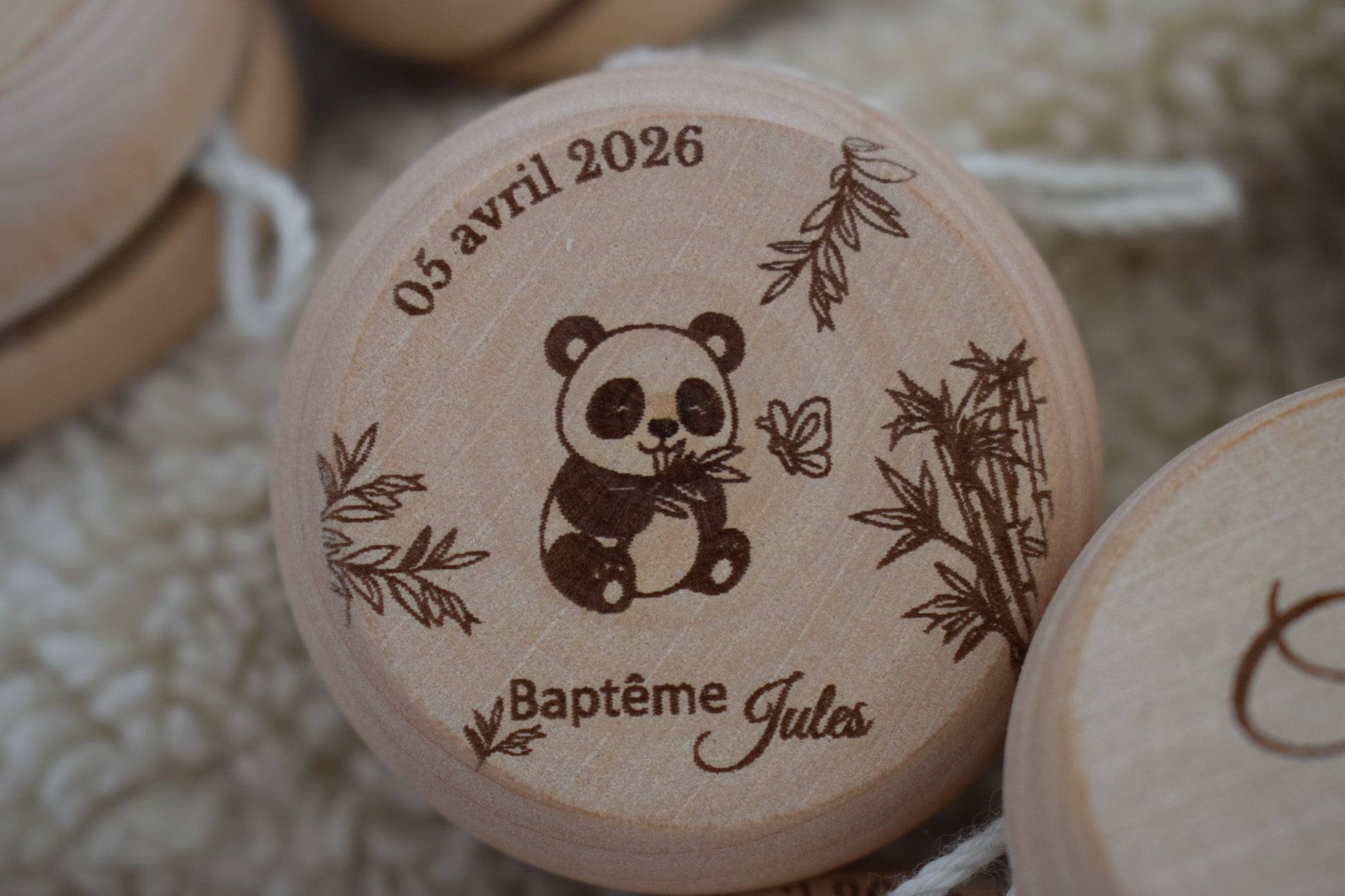 Offrez un souvenir ludique et original avec mon yoyo en bois personnalisé pour le baptême , gravé avec un adorable motif panda , le prénom et la date du baptême au recto, et le prénom de l'enfant qui reçoit le cadeau au verso.